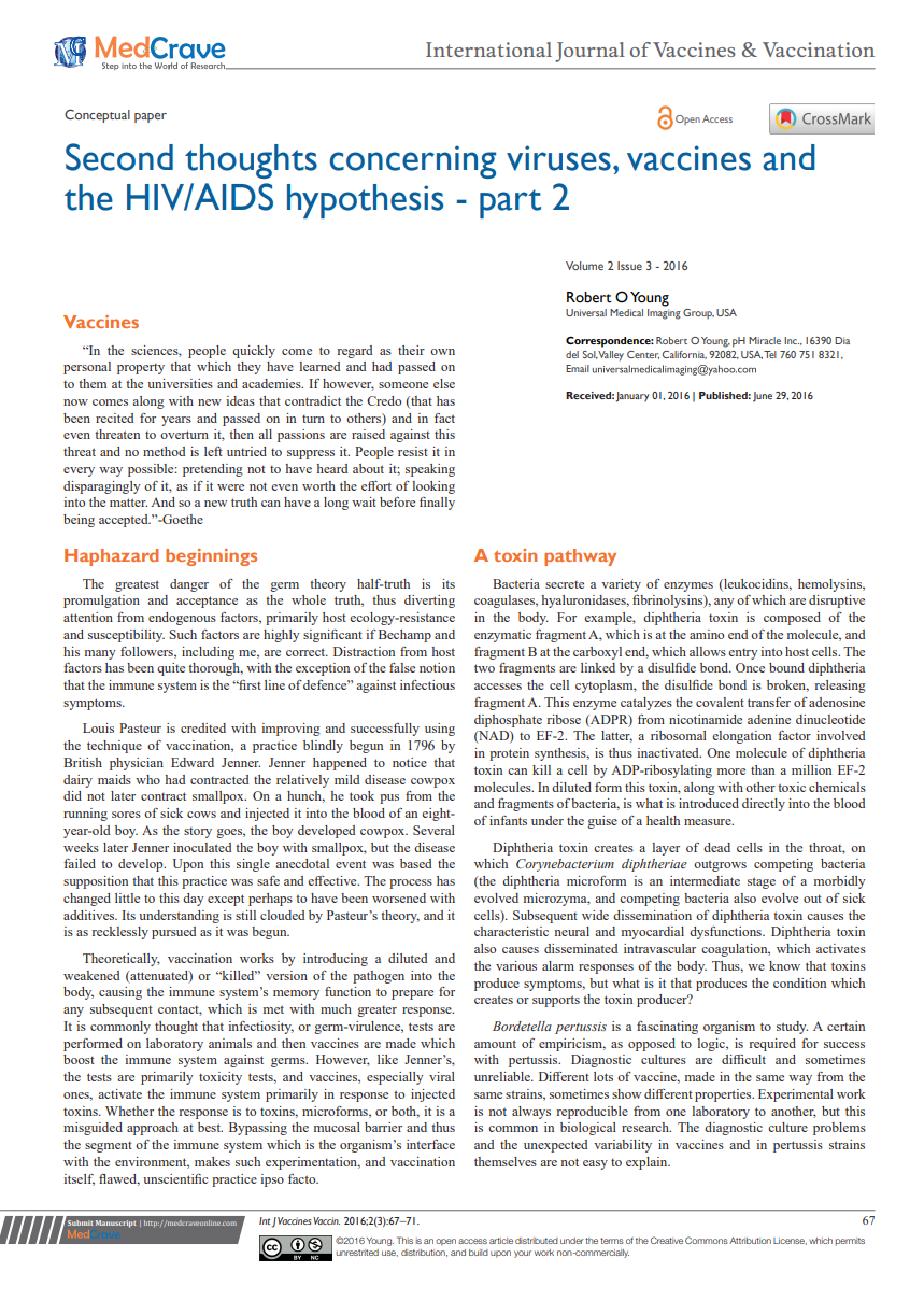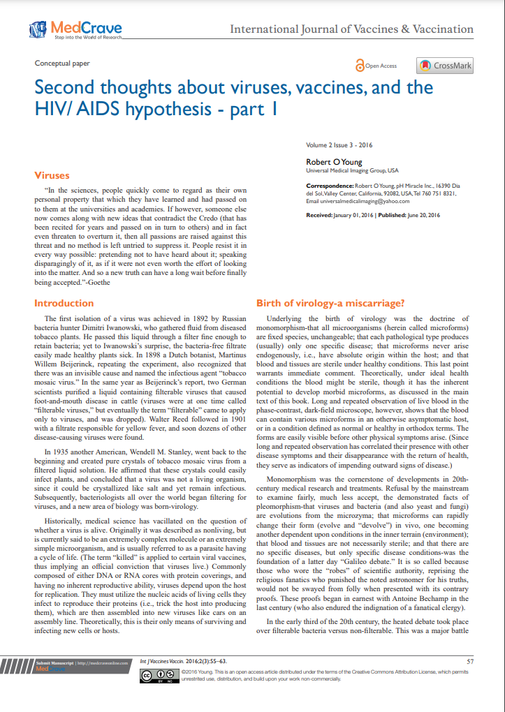 [1] Young RO (2016) Second Thoughts about Viruses, Vaccines, and the HIV/AIDS Hypothesis – Part 1. Int J Vaccines Vaccin 2(3): 00032. DOI: 10.15406/ijvv.2016.02.00032