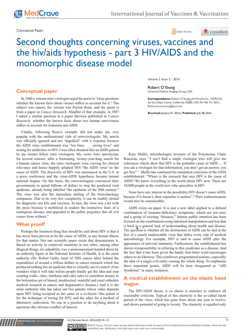 [3] Young RO (2016) Second Thoughts Concerning Viruses, Vaccines and the HIV/AIDS Hypothesis – Part 3 HIV/AIDS and the Monomorphic Disease Model. Int J Vaccines Vaccin 2(3): 00035. DOI: 10.15406/ijvv.2016.02.00035
