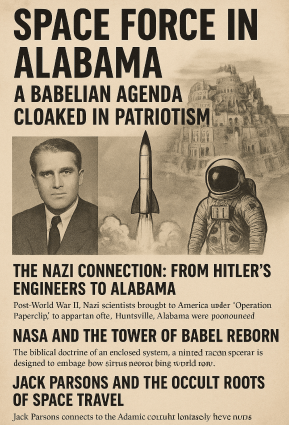 Placing Space Force in Huntsville is not random. It is symbolic. Alabama became ground zero for Nazi rocket engineers, who planted the seeds of America’s space deception. Now, decades later, the government seeks to militarize those same seeds. Huntsville, the “Rocket City,” may become the “Babel City” of the 21st century—a hub for mankind’s final rebellion.
